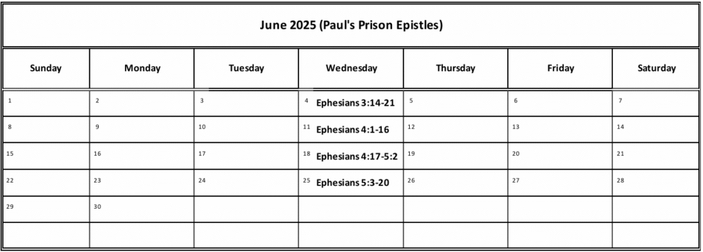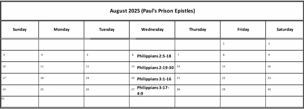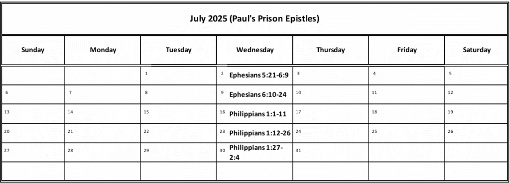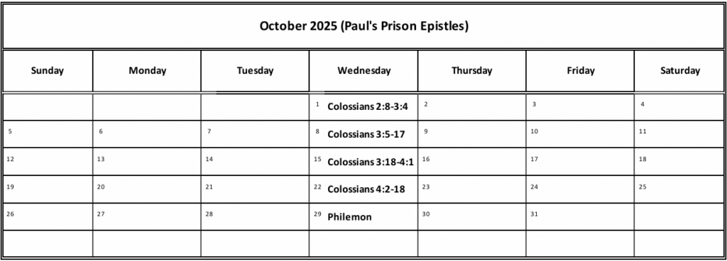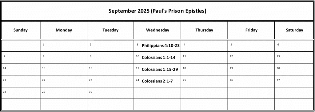 The Wednesday night Bible study will continue its study of Paul’s prison epistles. The prison epistles consist of the books of Ephesians, Philippians, Colossians and Philemon. We will be going through these books in the order that they appear in the Bible. We will continue to use the N. T. Wright “Bible Study Guides for Everyone” series as our resource for this study. An error was discovered in the Bible study calendar that was provided in last month’s newsletter. The corrected calendar, which has the current Bible study running through October 22nd, is provided below and at the end of the newsletter.